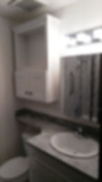 This next bathroom transforms from the 80's bright pumpkin orange Formica to a new modern look with cool tone and tile. Items replaced included lighting, vanity mirror, cabinets, countertops, sink, light switches, outlets, tub and surround, flooring and cove base. Additional storage was built into the new tiled shower surround with a custom tile design the client requested along with more countertop space by building an extension over the toilet. All making the most out of a smaller space.